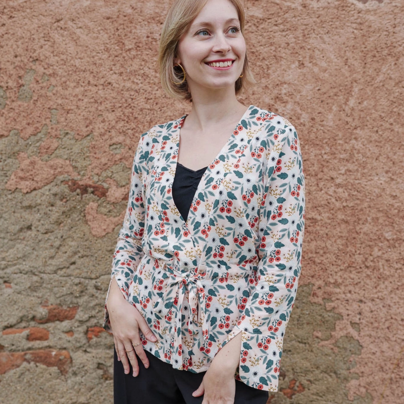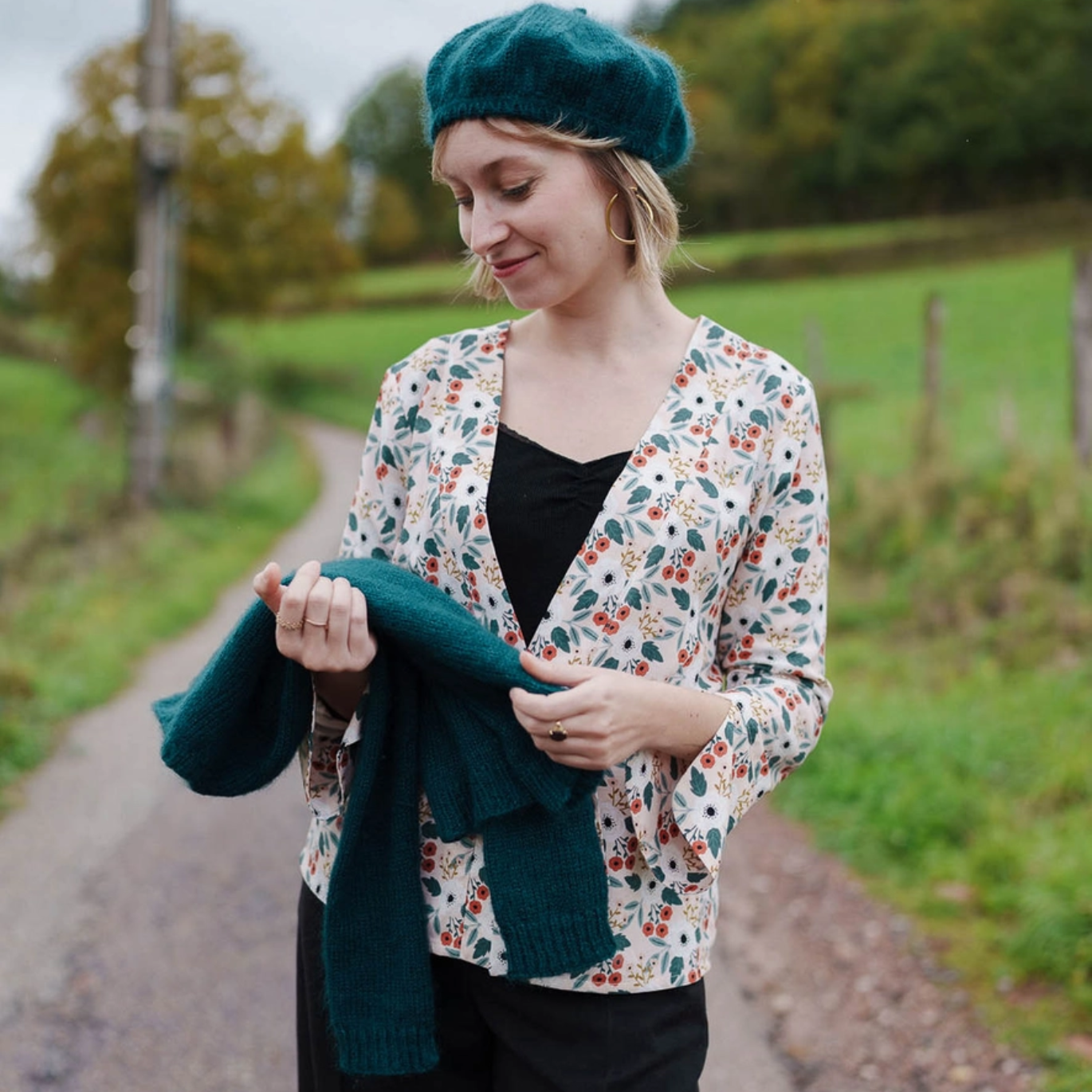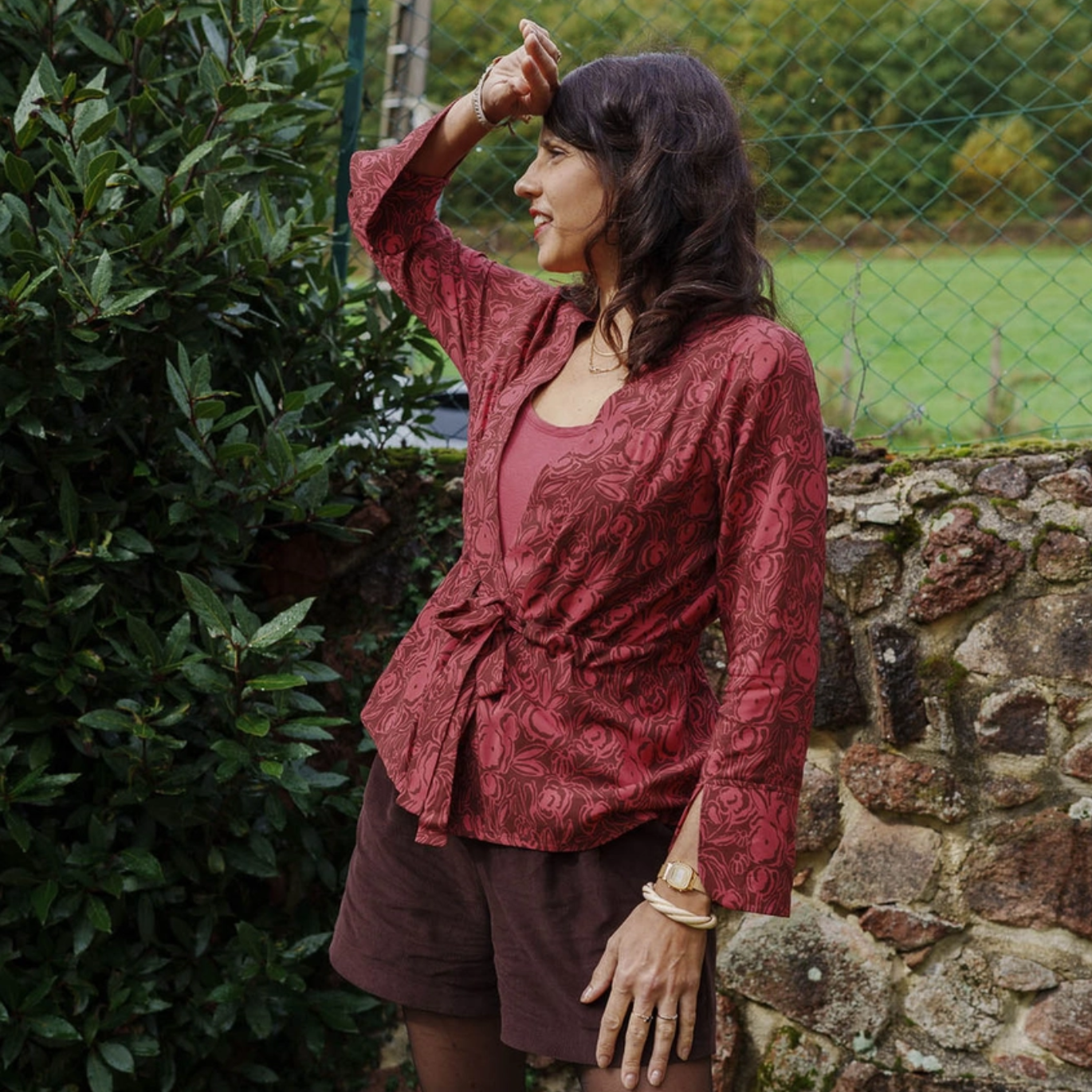 Liv est une blouse délicate croisée sur le devant, pensée pour se superposer à un top léger. Elle accompagne aussi bien les journées d’hiver en mode cocooning que les sorties, portée sur un joli caraco.