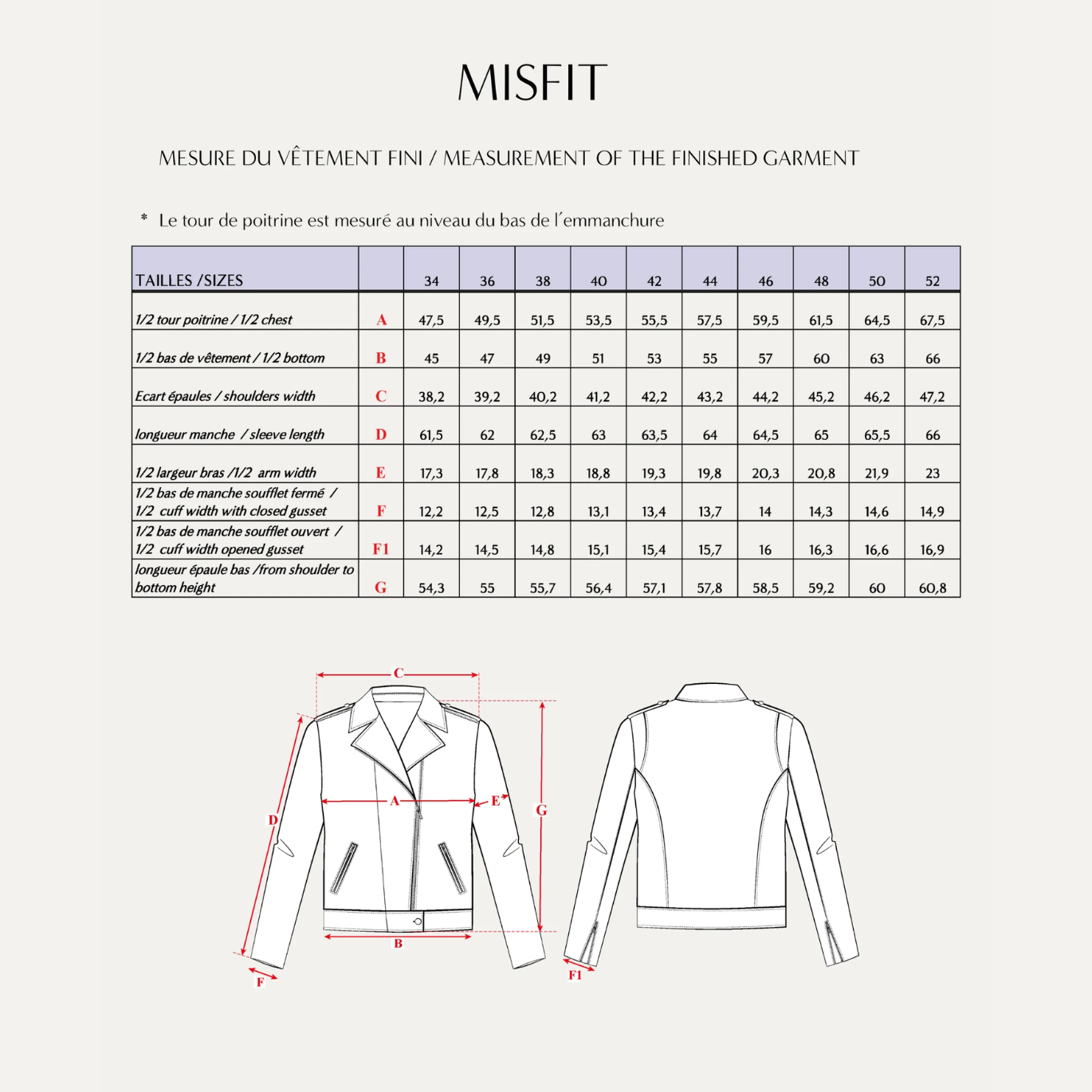 Le Patron Misfit grade du 34 au 52. Le tableau des mesures du vêtement fini est disponible dans les photos du produit