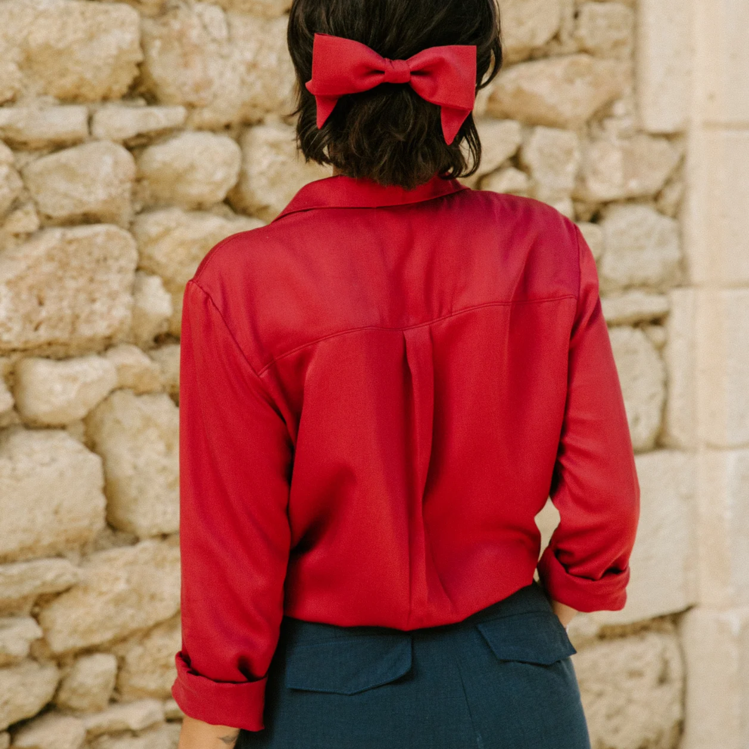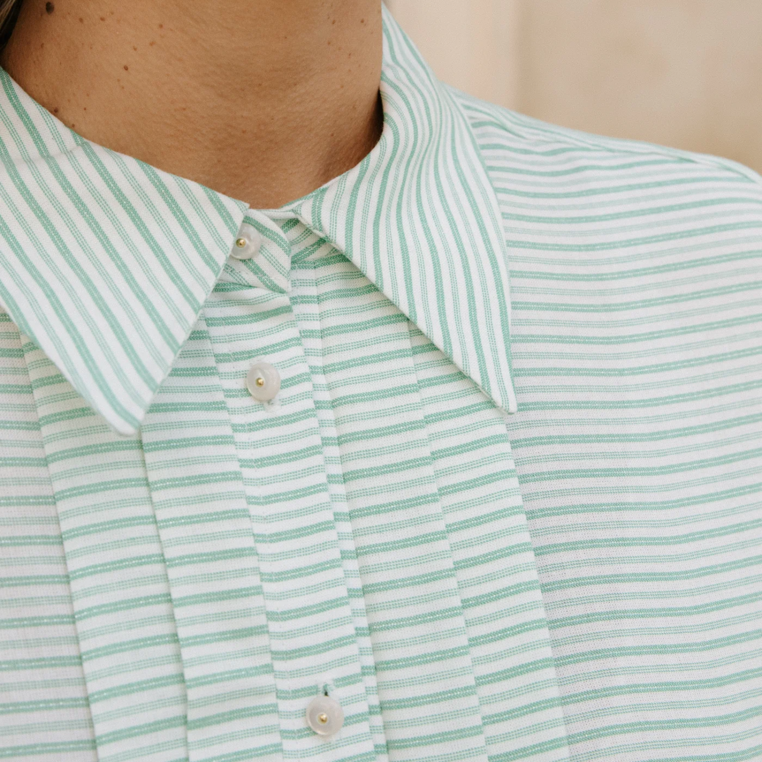 Son design : grand col aux pointes marquées, plis piqués sur le devant, pli rond dans le dos, coupe droite, intemporelle et épaule légèrement abaissée. Une version sans col, impeccablement finie par un biais, est également disponible dans le patron.