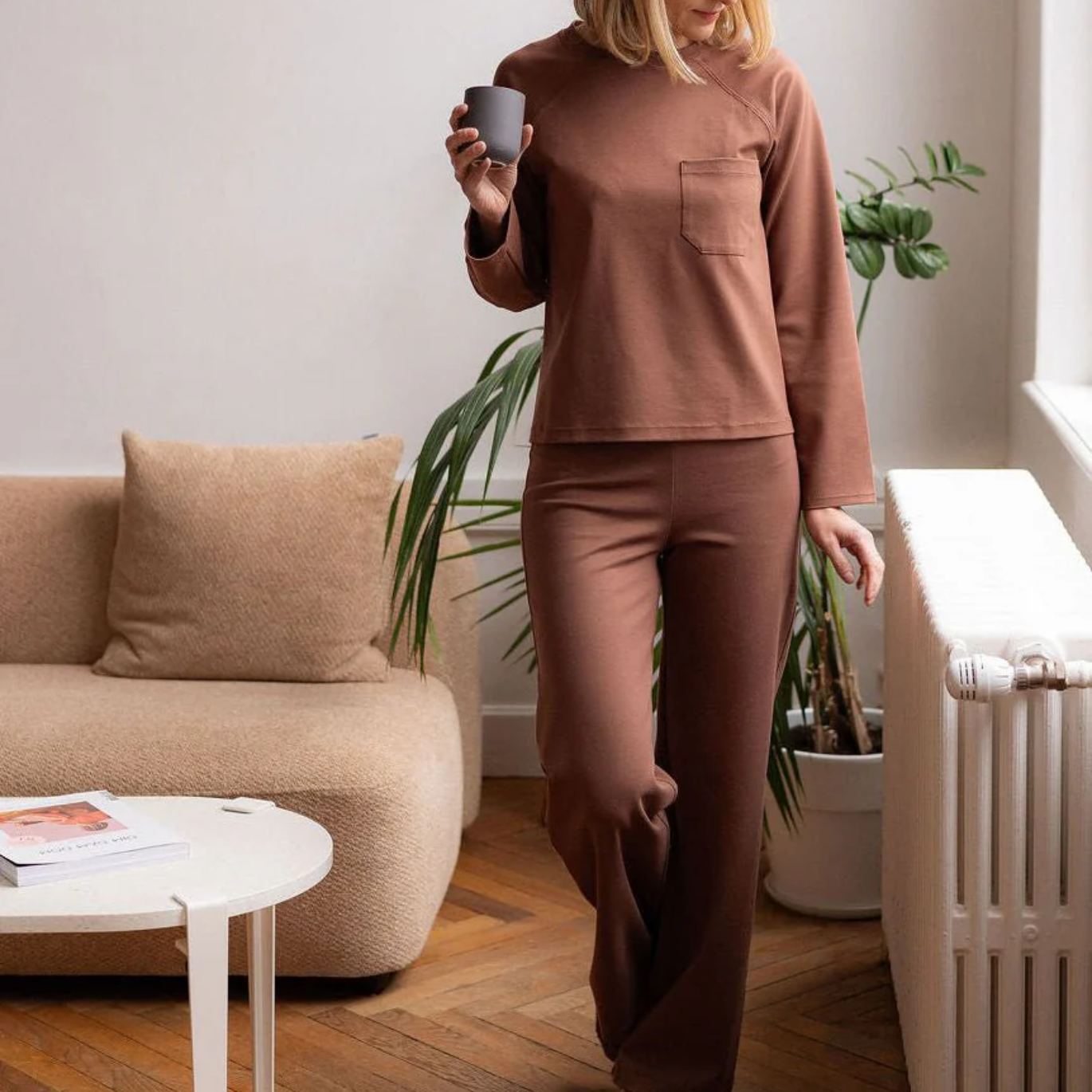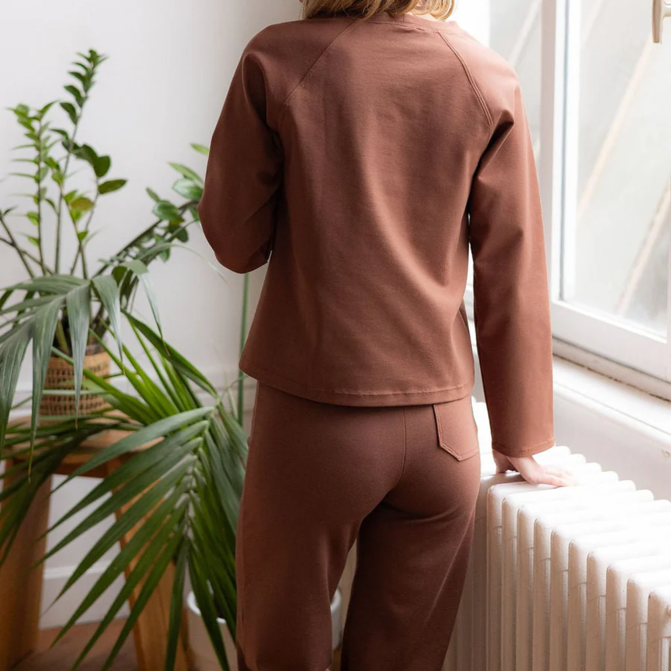 Pauline est un patron en jersey esprit "homewear" rapide et très facile à coudre, avec lequel vous pourrez réaliser un legging taille haute à la jambe ample à associer avec un haut manches raglan (2 longueurs de manches), déclinable en robe.