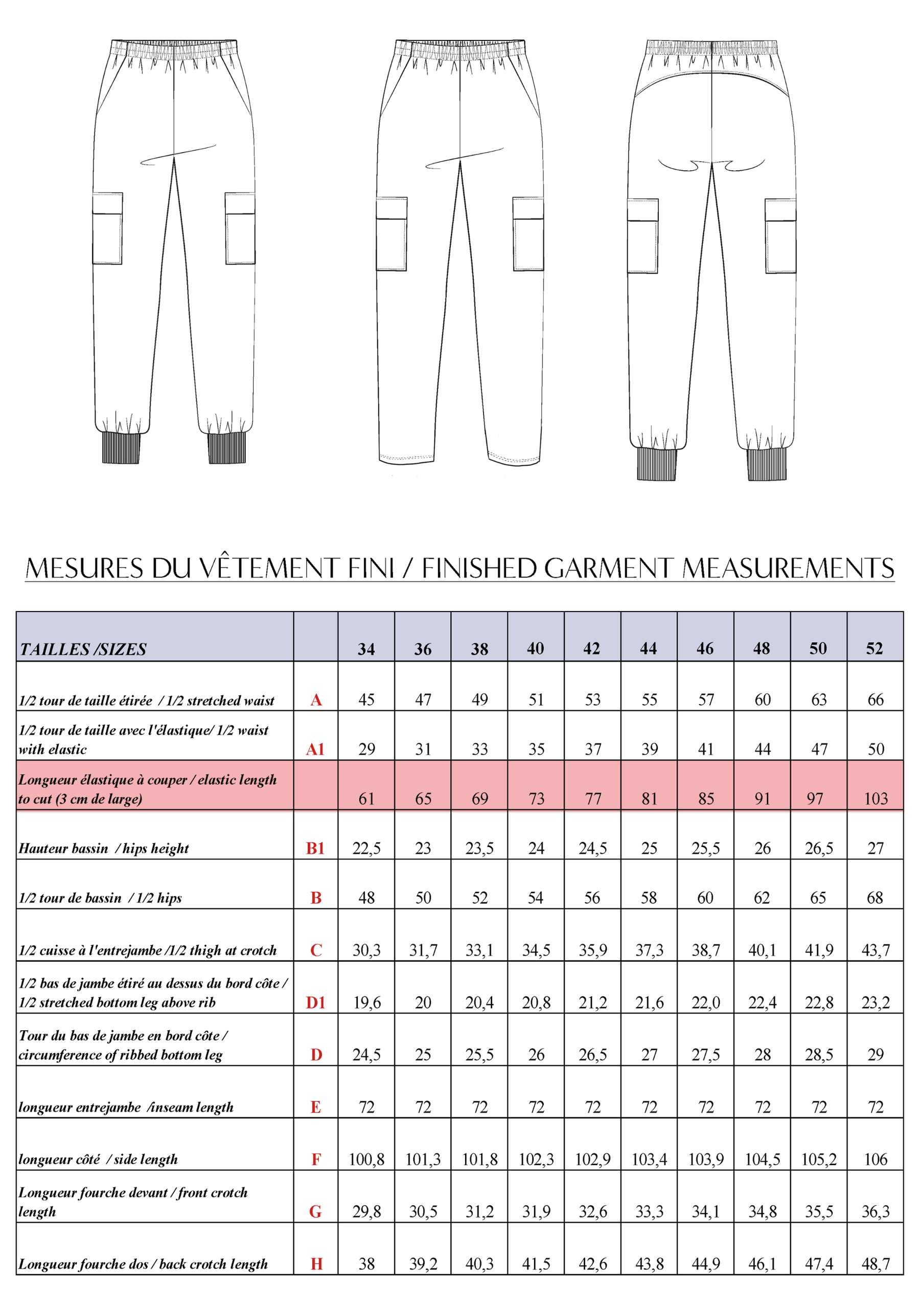 Les points techniques sont : la réalisation de la poche italienne qui se prolonge sur la taille, les poches plaquées à rabat, la taille élastiquée sous coulisse, et la pose d’un bas de jambe en bord côte.