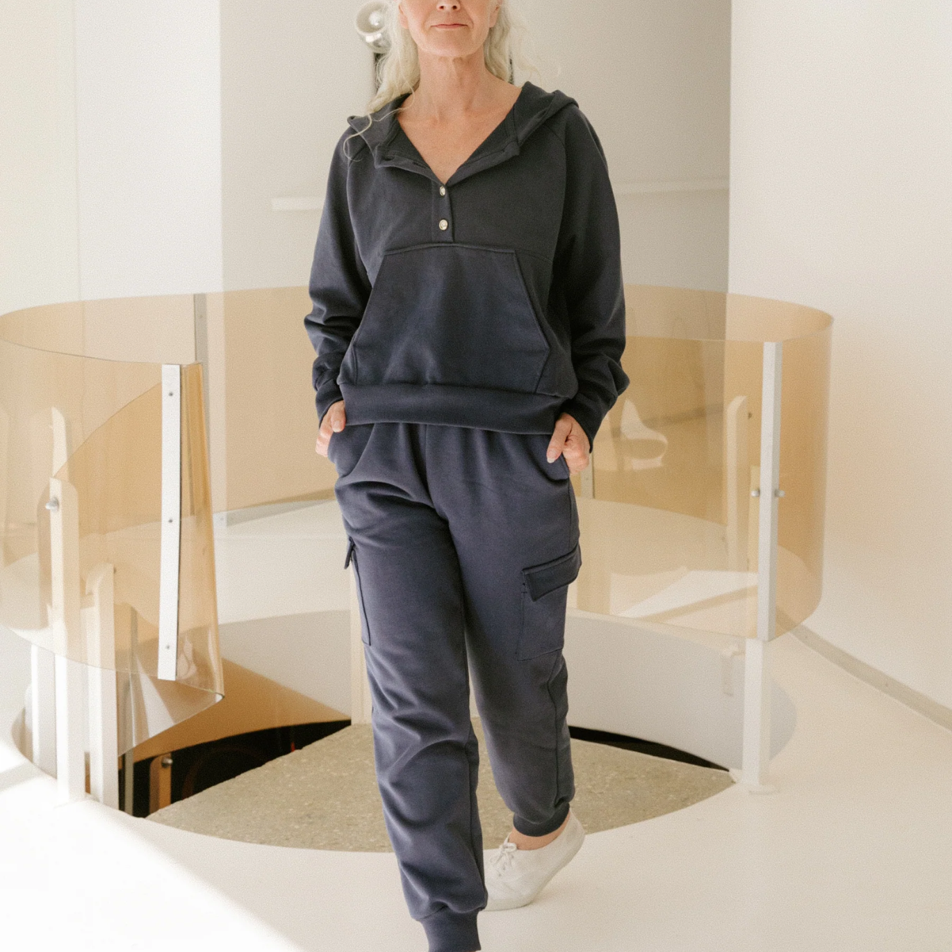 SASHA est un pantalon de jogging qui conjugue confort et jolies finitions. La taille élastiquée est intégrée dans le prolongement des pièces devant, évitant toute épaisseur disgracieuse. Le dos est structuré par une réhausse qui souligne le galbe.