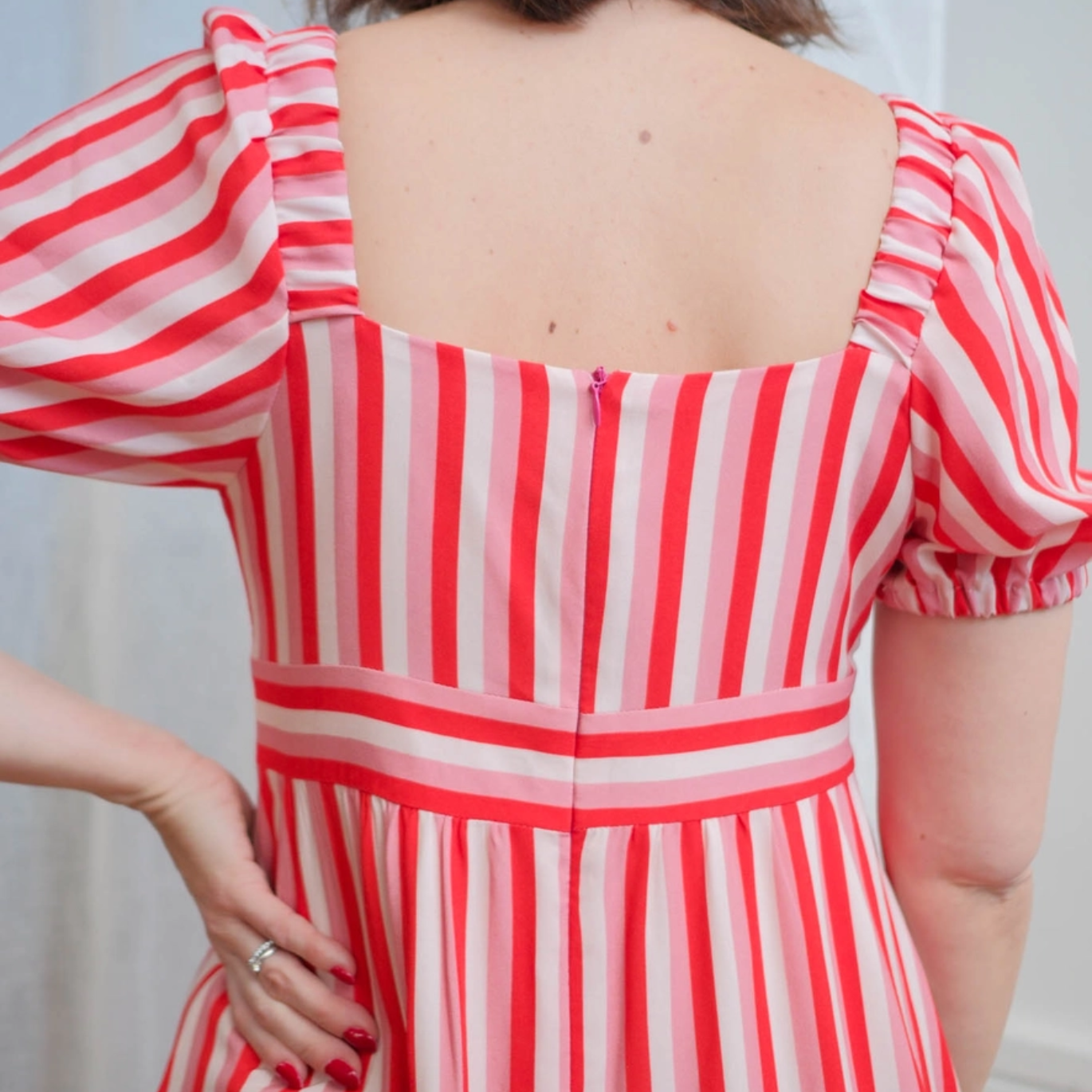 Laissez-vous charmer par notre robe de printemps : un buste cache-cœur ajusté, une taille empire, une jupe évasée et des manches bouffantes pour une allure romantique et élégante.
