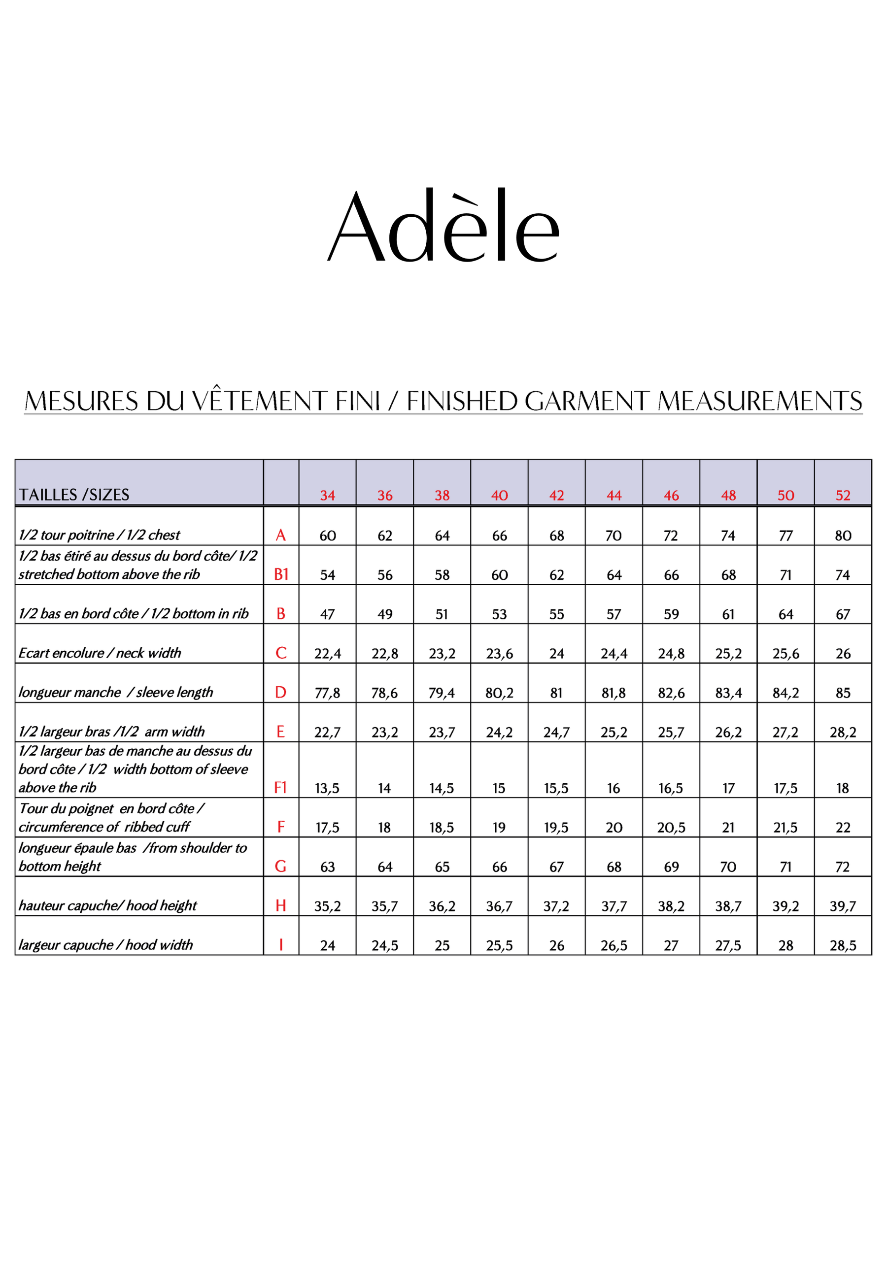 Le patron Adèle grade du 34 au 52. Le tableau des mesures du vêtement fini est disponible dans les photos du produit.