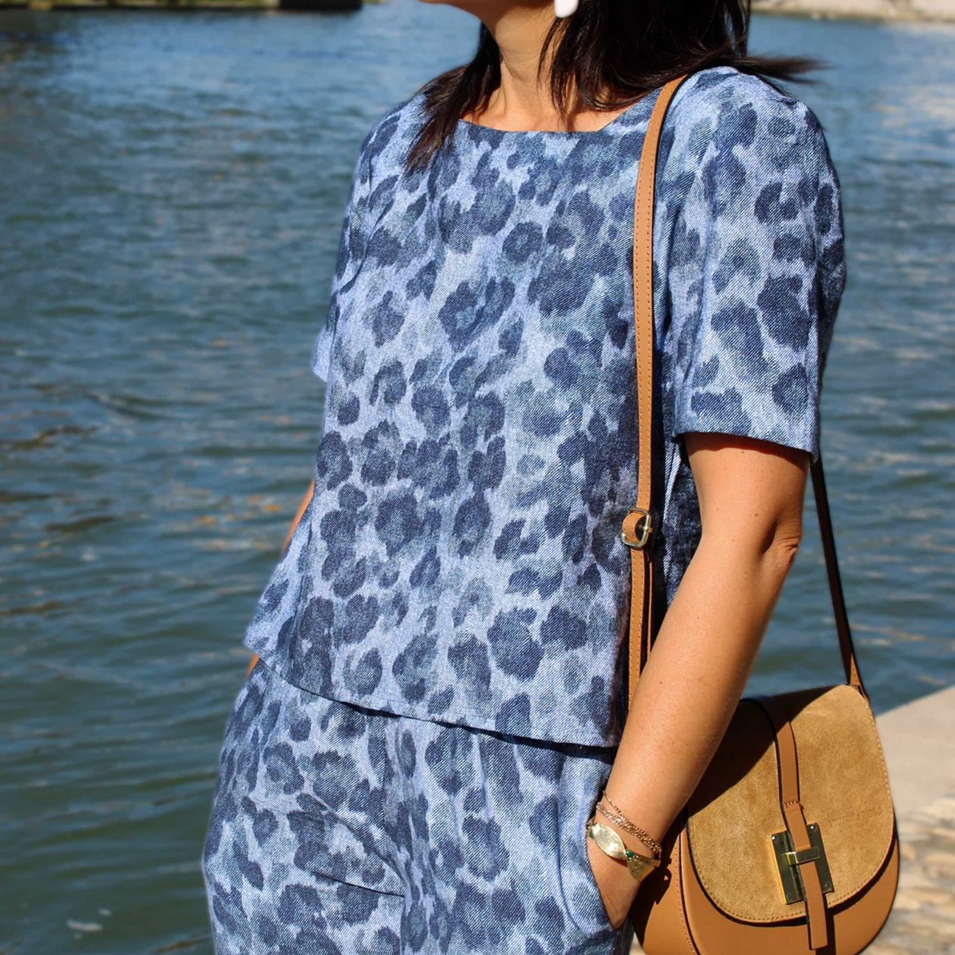 Une innovation My Dress Made : une viscose flammée à l’effet denim authentique, relevée d’un motif léopard finement dosé pour un style résolument moderne.