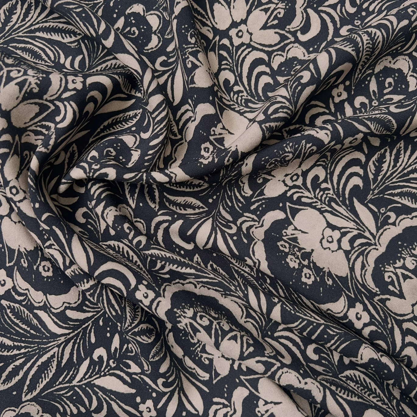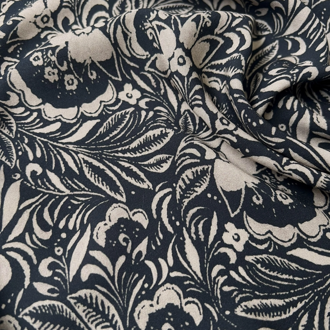 La viscose Marrinsky est parsemée d'un imprimé floral folk beige sur fond charbon.